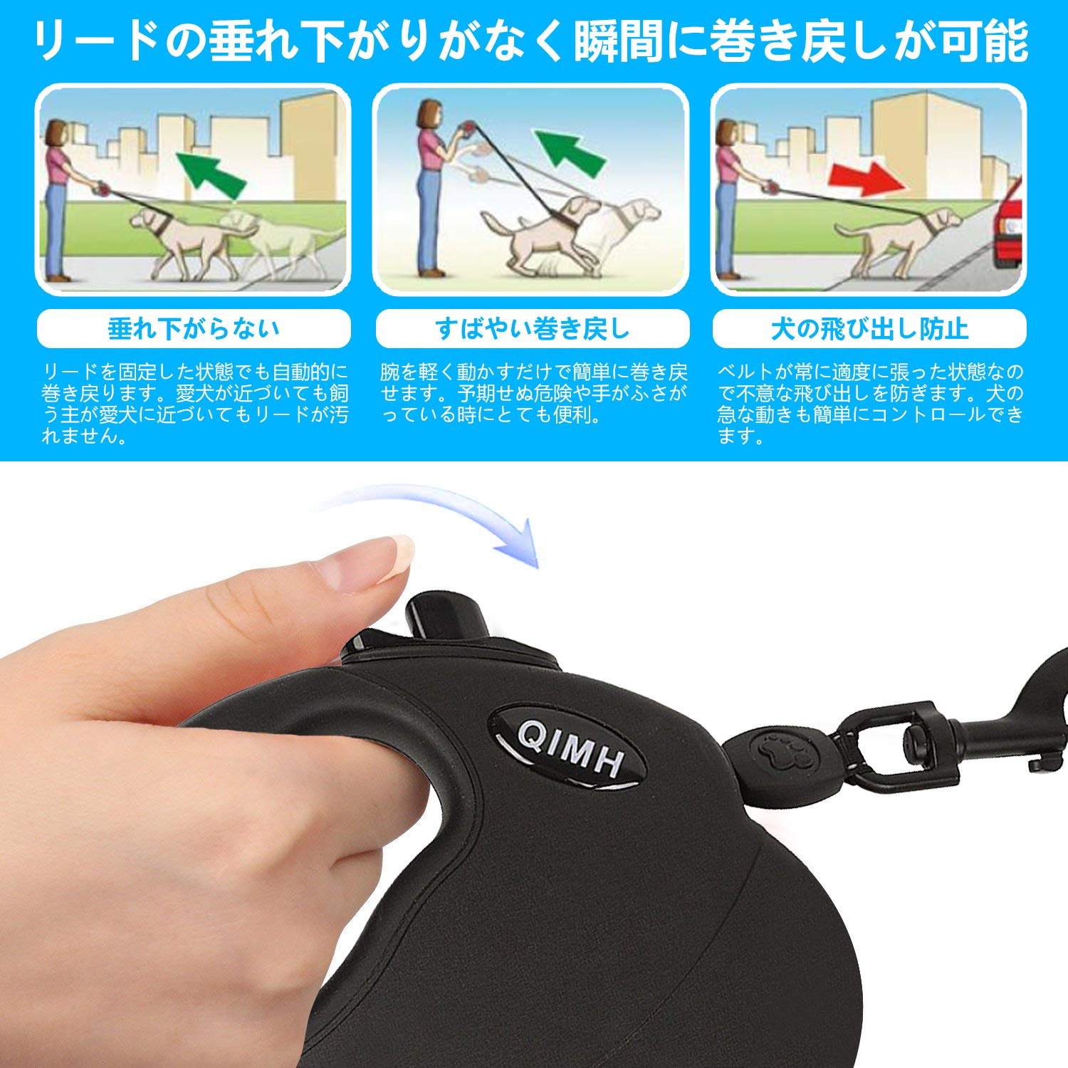 垂れ下がらない:リードを固定した状態でも自動的に巻き戻ります。愛犬が近づいても飼う主が愛犬に近づいてもリードが汚れません。すばやい巻き戻し:腕を軽く動かすだけで簡単に巻き戻せます。予期せぬ危険や手がふさがっている時にとても便利。犬の飛び出し防止:ベルトが常に適当に張った状態なので不意な飛び出しを防ぎます。犬の急な動きも簡単にコントロールできます。