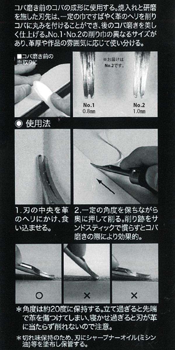 焼入れと研磨を施した刃先は、一定の巾ですばやく革のヘリを削ってコバに丸みを付け、後のコバ磨きを美しく仕上げることができます。