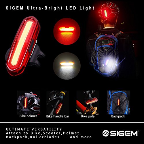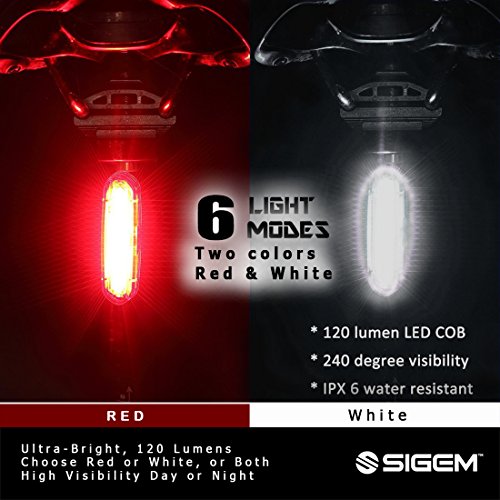 SIGEM - Premium Quality LED Bike Light (USB Rechargeable) SIGEM Ultra-Bright LED Bike Light.? All in one design bicycle light: Super bright 120 lumen output 6 lighting modes 240 degree visibility (Not 180°) USB Rechargeable, No wires or external batteries Light weight and durable design Water resistant IPX6 rating High-capacity lithium polymer battery (3.7V ?650 mAh) Can be used as a Bike Taillight, Headlight, Helmet light, and Backpack light. USB Rechargeable: Charges from your computer, Laptop or any device with a USB port. Smart Charging: 2 hour charging time (depending on charging device) Automatic, fully charged cut-off system Smart charging ensures longer battery life How to use: Press the Smart button for 2 seconds to switch ON or OFF. Press the button to select the desired mode. 2 LED Colors 6 lighting modes: Red White version:?Red High, Red Standard, White, Red strobe, Red slow strobe, Fast red White strobe.?? ? Mounting options: Horizontal or Vertical mounting. 360 Rotation. Rotate clockwise. WARNING: *Small parts. Not for children under 3 yrs. *Rotate clockwise *Ensure the screw at the back of the light is secured?tight regularly, as it can become loose if rotating anti-clockwise.? Package includes: 1x SIGEM bike tail light with Silicon strap 1x USB cable 1x Retail box This special offer price is available for a limited time only and so place your order today. 0 |
