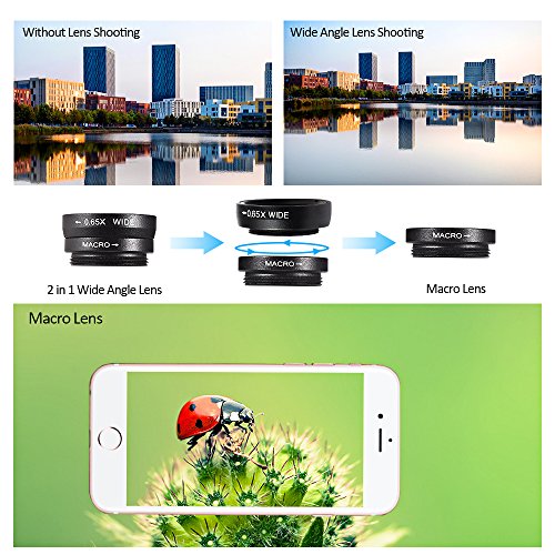 Function of Different Types of Lens 1/ With 12x telephoto lens attached to the phone, the object from far-away will become visible. 2/ 0.65x wide angle lens prefers to be used for shooting pictures with larger view. 3/ Macro lens magnifies the tiny little things so that we can capture the picture with their crisp details. 4/ 180 degree fisheye lens takes a cool curved shot that looks like real vision.