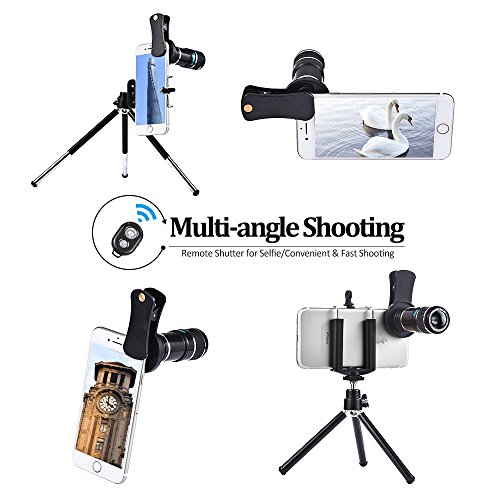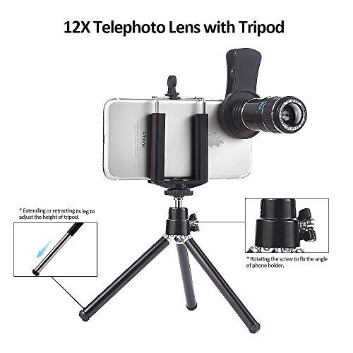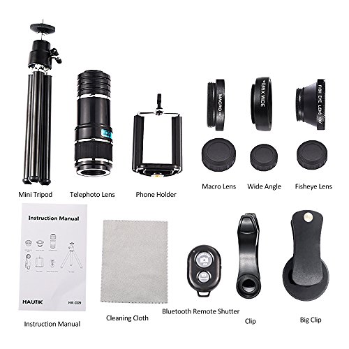 What you get? 1x 12x telephoto lens 1x 0.65x wide angle lens 1x macro lens 1x 180 degree fisheye lens 4x caps 1x cleaning cloth 1x big clip 1x small clip 1x Bluetooth remote shutter 1x tripod 1x user manual 1x pouch