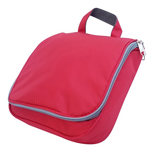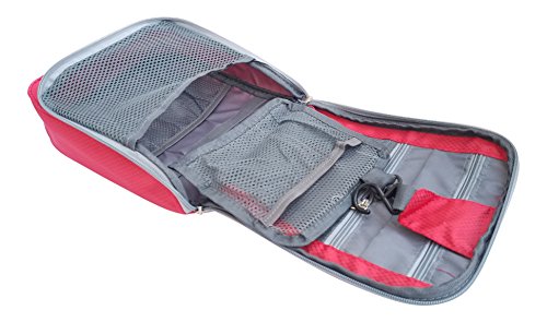 - Travel Toiletry Bag featuring water-resistant nylon fabric construction, 3 mesh slip pockets, 6 elastic loops, 2 zipper pockets, and a reinforced hook to easily hang the bag. Measures approximately 9.5" x 3" x 8.25"