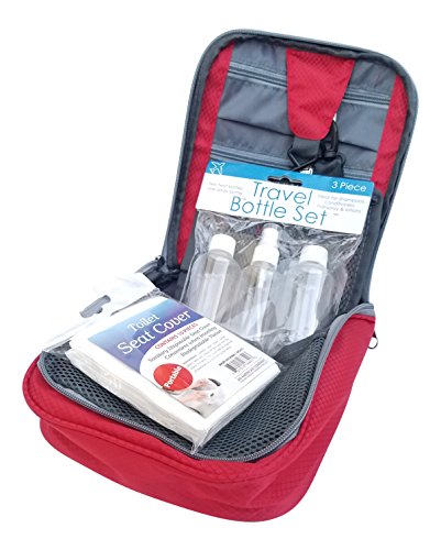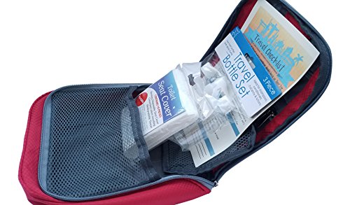 Travel Essentials Bundle- Travel Toiletry Bag, Toiletry Bottles, Disposable Toilet Seat Cover, and Travel Checklist (Red)