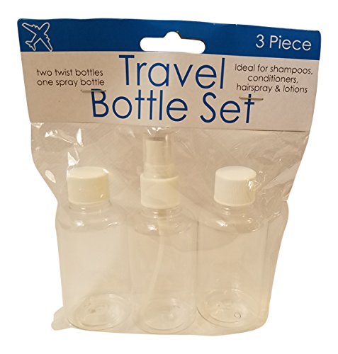 - Travel Twist Top & Spray Bottle Set includes 2 twist top bottles and 1 spray bottle with a cap.