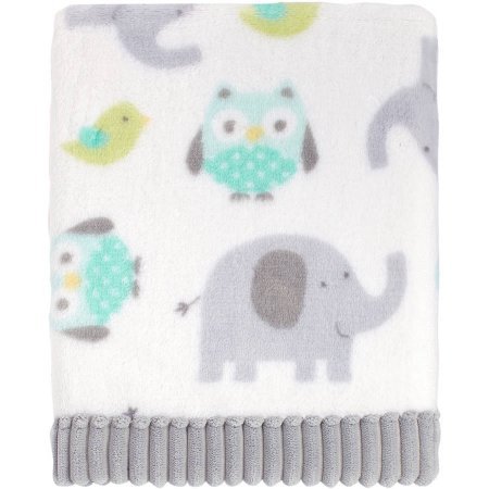 Baby Elephant, Owls and Birds Soft Blanket with Gray Trim