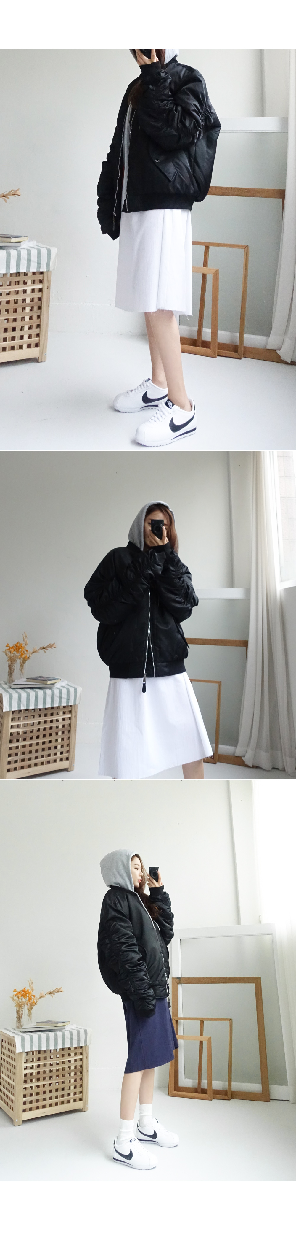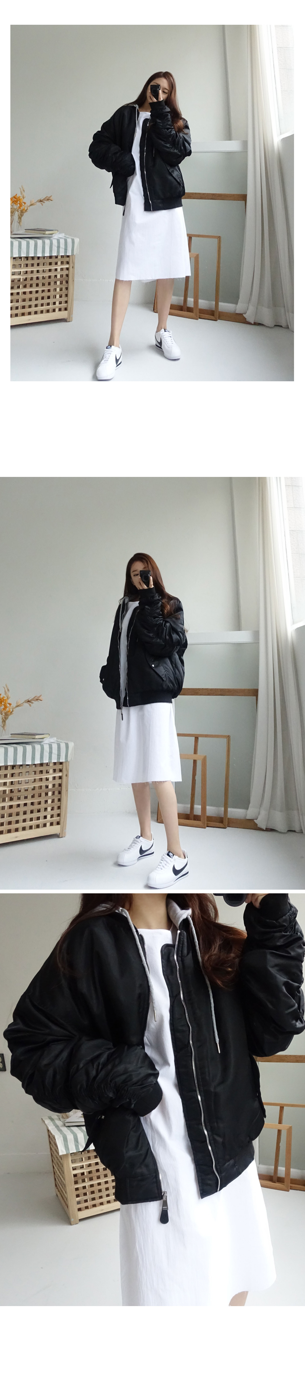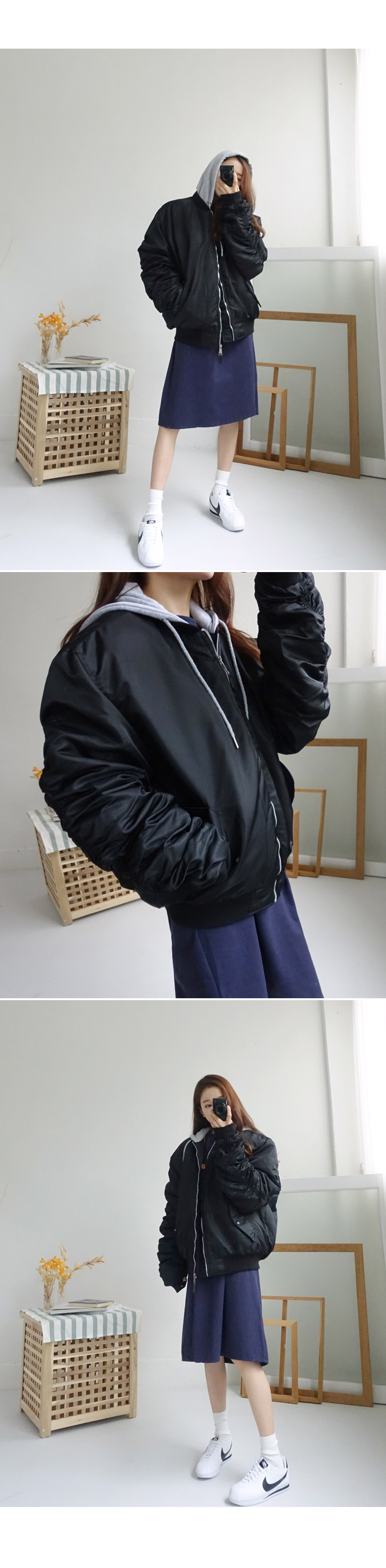 도톰한 패딩 항공점퍼로 겨울까지 쭈욱 즐기기 좋구요 후드를 더해주어 실용성까지 신경써서 제작되었습니다! 모델언니처럼 무심하게 툭 걸쳐 입어도 스타일리쉬한 매력이 느껴지는 아이템이에요^^