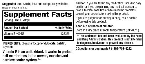-. Feature : Good Sense Vitamin E 400 IU Softgels / One Softgel daily / Easy to swallow / Dietary Supplement / This product contains: no preservatives, no artificial colors, no artificial flavors, no lactose, no yeast, no gluten.