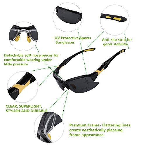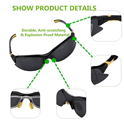 -. Feature : ❤️STYLISH PREMIUM FRAME--Flattering lines create aesthetically pleasing frame appearance. Made of high quality which is Durable, Anti-scratching & Explosion Proof Material.High quality frame materials provide the ultimate in performance and comfort. Polycarbonate frames are impact, scratch resistant, durable and unbreakable. / ❤️SOFT RUBBER NOSE PAD--Detachable soft nose pieces for comfortable wearing under little pressure while Detachable frame is designed for near sighted lens. Anti-slip strip for good stability when you are playing vigorous sports. / ❤️ CLEAR, SUPERLIGHT, STYLISH AND DURABLE--Lightweight design is ideal for motorcycle and cycling bicycle, driving, running, fishing, racing, skiing, climbing, trekking or other outdoor activities. Fashion and stylish design, with rich color combinations of frames and lens. / ❤️PERFECT BIKE SPORTS SUNGLASSES--Great for outdoor activities like cycling, fishing, driving, etc. / ❤️POLARIZED LENS--100% UV400 protection coating,blocks 100% harmful UVA & UVB Rays.Restore true color, eliminate reflected light and scattered light,make the scenery more clear and soft and protect eyes perfectly.Which not only limits light that your eyes are exposed to,but also ensure that no light of wavelength 400 nanometers & below reach your eye. Since light with wavelength below 400 nanometers are the ultra violet light range which causes damage to eyes.Give you complete UV protection.
