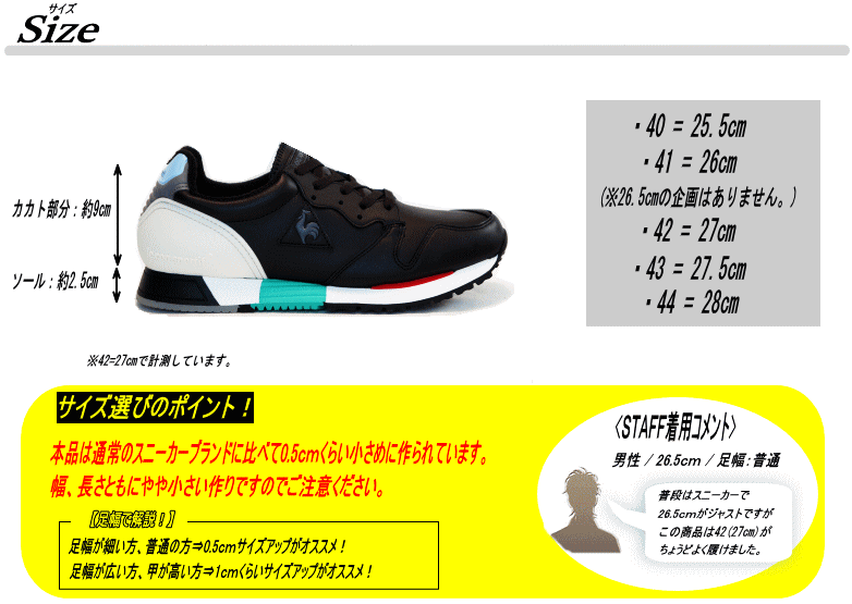 | サイズ | 作り⇒やや小さめ (※26.5cmの企画はありません。) 【サイズ選びのポイント!】 足幅が細い方、普通の方⇒0.5cmくらいサイズアップがオススメ! 足幅が広い方、甲が高い方⇒1.0cmくらいサイズアップがオススメ! |