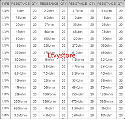 Ltvystore 1280pcs 64 Values 1 ohm - 10M ohm 1/4W Metal Film Resistors Assortment Kit Assorted Set