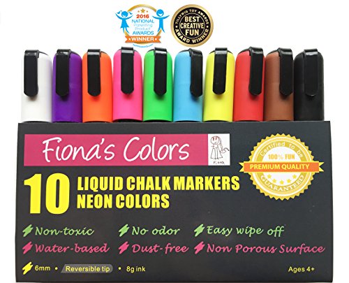 National Parenting Product Award Winner: Fiona's Colors Wet Erase Non-Toxic Liquid Chalk Markers, 10 Assorted Neon Colors, 6mm Tip /8g ink - For Use on Whiteboard, Chalkboard, Window, Glass