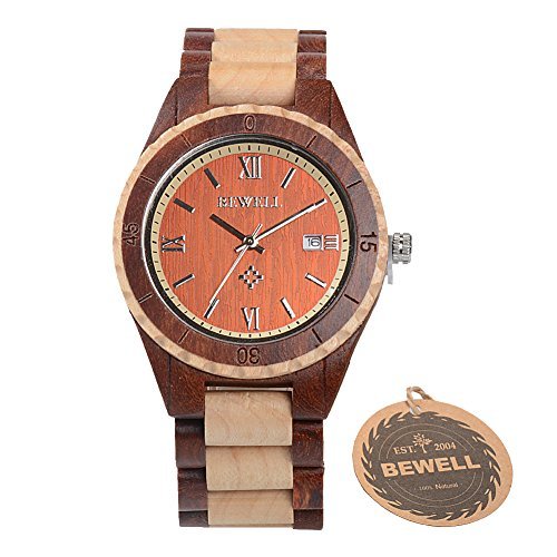 -. Binding : Watch -. Brand : Bewell -. Department : Mens -. Feature : Handmade Watch -- Made of 100% natural wood from Africa and North America and is hand-crafted and polished well. / Unique Style -- Every Bewell watch has distinctive wood grain and a slight sandalwood smell. Light weight makes it so nice to wear. / Analog Display -- Quartz movement; Date display at 3 o'olock; 36 months battery life; Luminous hands make it easier to read the time in the dark. / Adjustable Band -- 1:Adjust needle aim at the side hole 2:Stand the watch 3:use a little hammer to knock the needle 4:Take off the watch link needle and links 5:Brought the band back and press out. / Perfect Gift -- Good choice for a stocking stuffer as Christmas, birthday gift, even a great conversation starter compared with common steel watch. -. Label : ZS -. Manufacturer : ZS -. MPN : W128AG -. PackageQuantity : 1 -. PartNumber : W128AG -. ProductGroup : Watch -. ProductTypeName : WATCH -. Publisher : ZS -. Studio : ZS -. Title : Bewell Wooden Watch for Men Contrasting Color Band Round Face Quartz Movement Wristwatch
