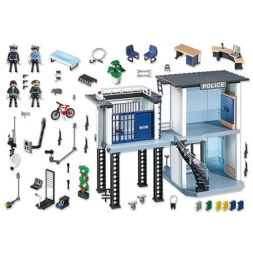 -. Feature : Protect the town with the Police Station with Alarm System / Enter through the main office and head upstairs to process suspects in the screening room / Screening room equipped with camera, height chart, laptop, desk, TV monitor, cabinet, and more / Detain criminals in the P.R.Ison cell with lockable gate / Includes four figures, helipad, reception desk with computer, satellite dish, security cameras, and other accessories