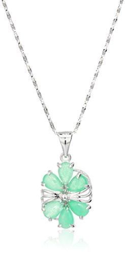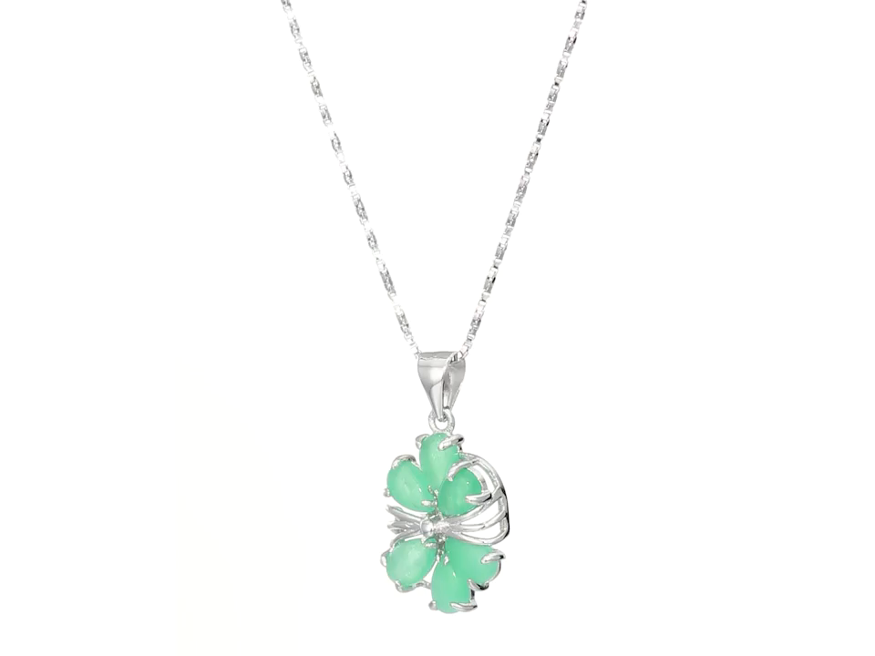 Rhodium Plated Sterling Silver Green Jade Flower Pendant Necklace, 18"