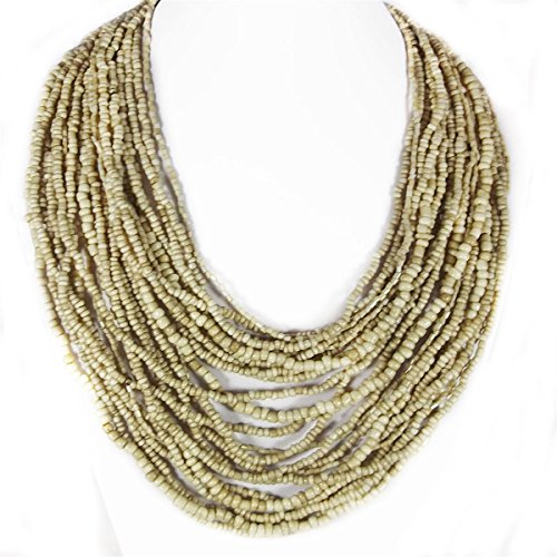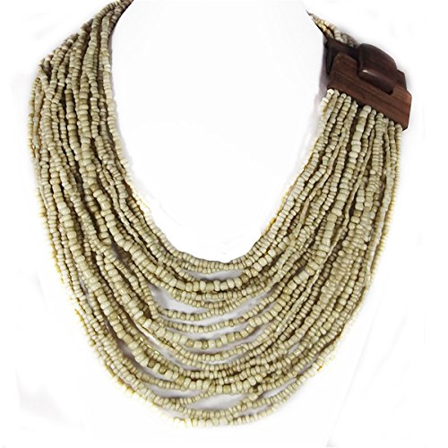MULTI LAYERED STRANDS NECKLACE total chain length 17.5 inches; material: strands of beads with wooden clasp; color: cream; clasp: natural wooden of brown color