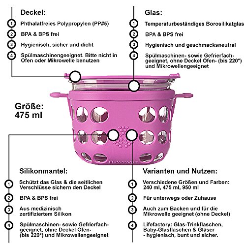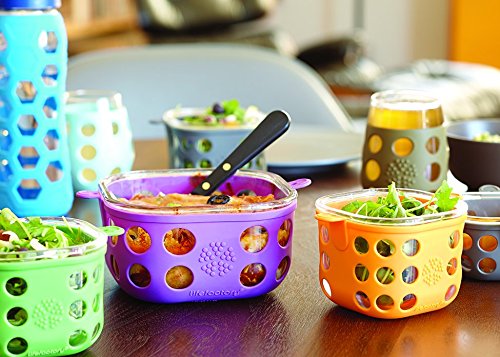 Studio : Lifefactory Kitchen Publisher : Lifefactory Kitchen Binding : Kitchen Product Description Add a dash of design to your lunchbox, cabinets, and fridge with Lifefactory’s mobile food storage collection. Delivering functional utility matched with delightful vibrancy, Lifefactory glass storage containers are perfect for packing healthy snacks, lunches, and for storage at home. Built for mobility, these innovative food containers are durable enough to travel to the park for a picnic making it a great alternative to plastic. The silicone sleeve features a button closure that secures the container to the lid. Offered in a range of colors with 1, 2, and 4 cup capacities, Lifefactory mobile food storage containers can be mixed and matched and the bright colors make it easy to identify foods in crowded refrigerators and cabinets. Constructed of tempered glass with a heat-safe silicone sleeve, the containers are oven, microwave, freezer, and dishwasher safe. For easy care, the containers can be placed in the dishwasher with the silicone sleeve on. The polypropylene lid is dishwasher and freezer safe, but shouldn’t be used in the oven or in microwaves. Reusable Lifefactory mobile storage containers offer a non-leaching alternative to plastic food storage. The lid is constructed of BPA/BPS-free polypropylene (PP#5) with no phthalates, PVC, or polycarbonates. The sleeve is constructed of durable BPA/BPS-free silicone. Made in North America: glass made in Mexico, sleeve and lid made in the USA. 0