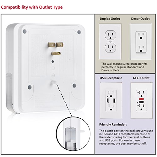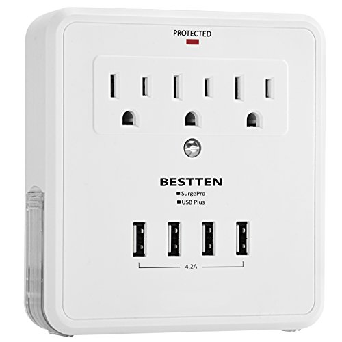 Bestten Multi Outlet Wall Mount Adapter Surge Protector with Four (4) USB Charging Ports, 3 Electrical Outlet Extenders and 2 Slide Out Phone Holders