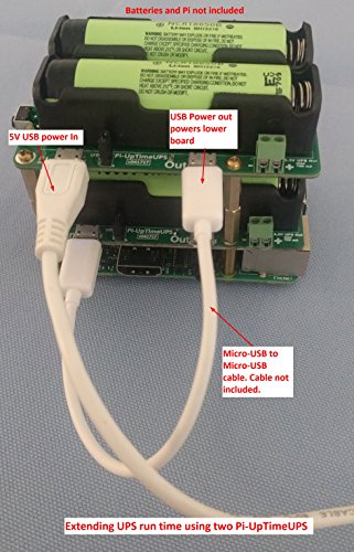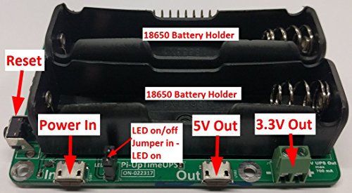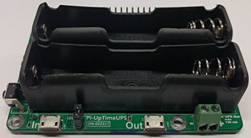 Studio : Alchemy Power Inc. Publisher : Alchemy Power Inc. Binding : Electronics Product Description Alchemy Power Inc. Pi-UpTime UPS provides UPS power. Power that is clean, stable, reliable, uninterruptible to the Raspberry Pi. Pi-UpTime UPS provides power mobility for the Raspberry Pi. Install one or two 18650 unprotected batteries (purchased separately) in the Pi-UpTimeUPS battery holder(s) and the Raspberry Pi continues to operate even when power fails or when the power plug is disconnected. The batteries are charged when power is available. UPS 5V and 3.3V (max 0.7A) is also available for other use. Battery level is monitored via GPIO 26. Sample software provided uses GPIO 26 and ensures a proper shut down when the battery power runs low. A power reset switch on Pi-UpTime UPS makes it easy to reboot the Raspberry Pi after a software shutdown. See image which shows two Pi-UpTime UPS stacked together. In our labs with two units, we have clocked around 20 hours run time on a Pi-3. Your run time will vary depending on battery capacity and what else is going on. NOTE - BATTERIES NOT INCLUDED. Note 1: after a discharge, without a proper shutdown when the batteries run low, the Raspberry Pi may reboot several times. Once the batteries are charged above 3V, the Pi will reboot properly. Please use the demo shutdown code to prevent the reboot sequence. Note 2: When purchasing cells, please note the discharge capability of the cells. If it says 0.2C and the cell/battery is rated for 2500 mAh, the max current is 0.5A for the battery. With 2 batteries installed, max current you can get is 1A. To reboot a Pi-3 you will need slightly more than 1A for reboot, expecially if you have other things installed on the Pi. 0