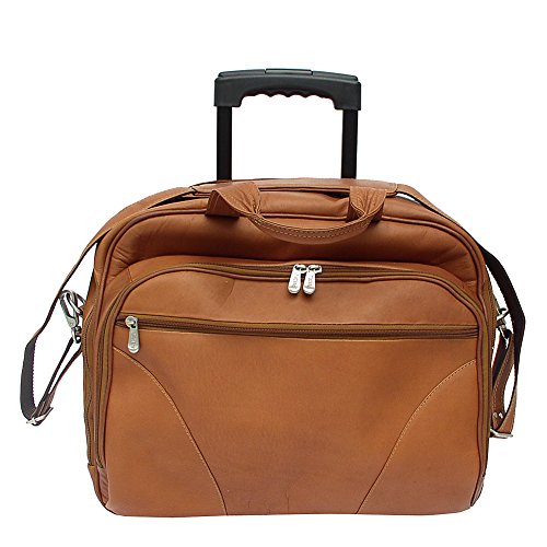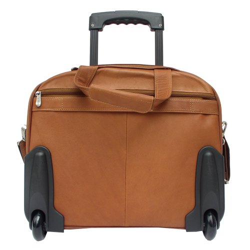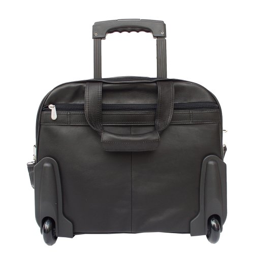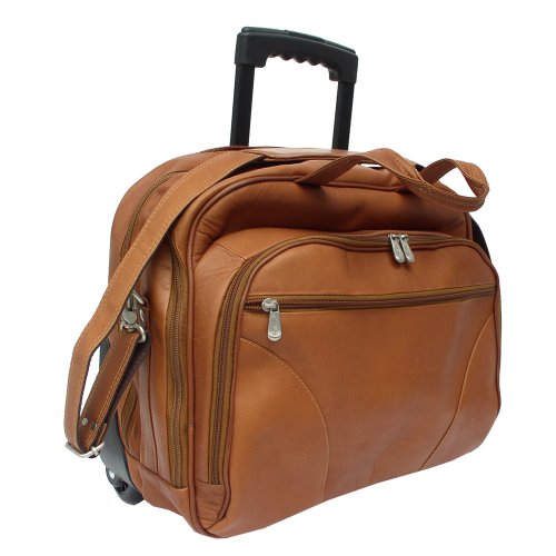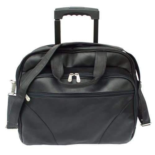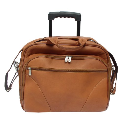 Studio : Piel Leather Publisher : Piel Leather Binding : Apparel Product Description Two large zip compartments, back zip compartment with a three section divider for files, front zip pocket with padded laptop pocket (15 inch x 12 inch x 2 inch) and additional storage space. Front pocket with full organizer, and a front and back zip-pocket. Telescopic handle, roller blade wheels, back strap to attach to a telescopic handle, double top handles for easy carrying and an adjustable/detachable shoulder strap. 0