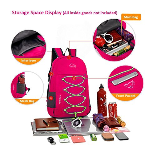 Compact: Fold into zippered inner pocket to fit anywhere. Unfold from pocket to backpack. More storage space and keep things organized: 1 x main bag: To carry what you need in the trip, 1 x interlayer: For your computer, books, 1 x zippered inter bag: A perfect place for valuables such as cash, credit cards and passport. 1 x front bag: Great for any quick access such as guide books. 2 x side mesh bag: For your travel mug, umbrella, lightweight (0. 5 Pounds) and roomy (25 liters): A true space saver. Stuff the bag into its own pocket for storage and unzip it when you reach your destination. Avoid overweight charges, simply unfold from your luggage and use it as a carry on for your excess baggage. Durable: The backpack is made from highly rip and water resistant nylon fabric, provide strengthen and long-lasting performance with minimal weight. Stress points are reinforced with bar tacking for increased longevity. Dimensions: Unfold 17. 5 x 12 x 5 inches/fold 7 x 6. 5 x 2. 5 inches.Feature