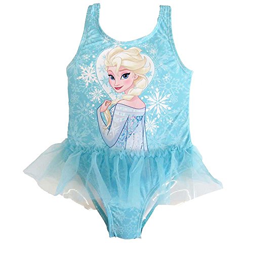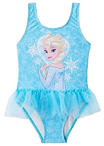 Toddler girl's swimsuit features Elsa from Disney's Frozen movie with coordinating tutu. In blue. 85% Polyester 15% Spandex - Lining: 100% polyester. Machine washable. Imported.