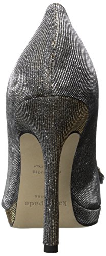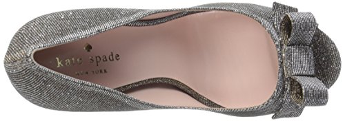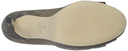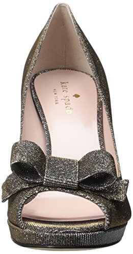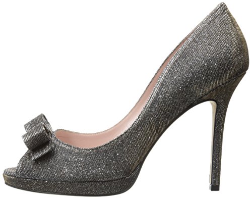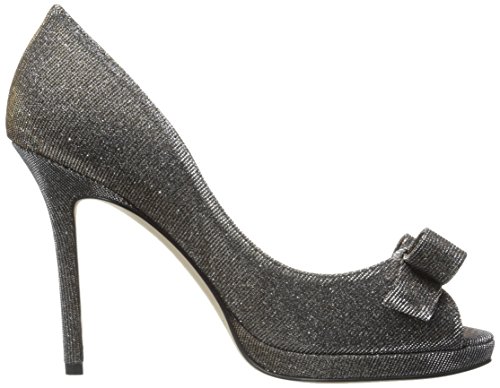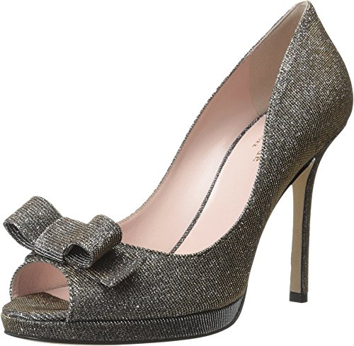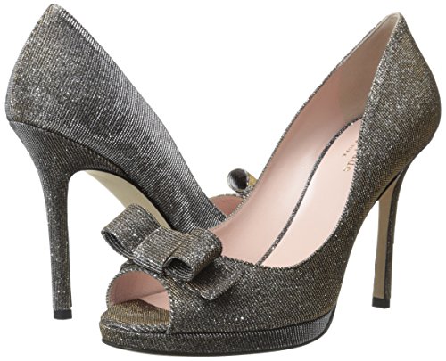 Metallic peep-toe pump featuring covered platform and decorative bow