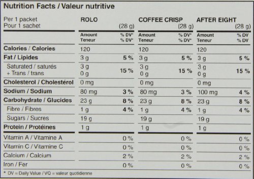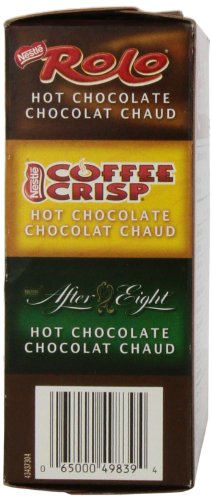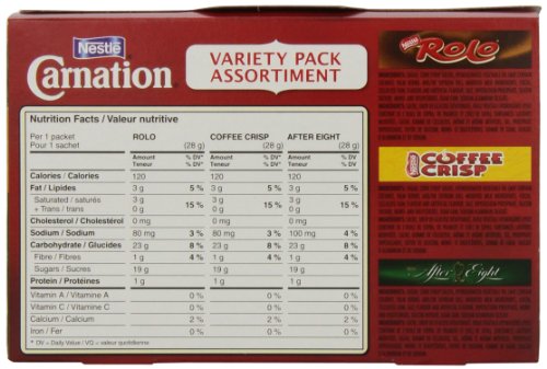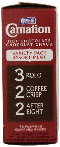 NESTLE CARNATION HOT CHOCOLATE VARIETY PACK ROLO, COFFEE CRISP, AFTER EIGHT, 7-COUNT BOX, 28G ENVELOPES