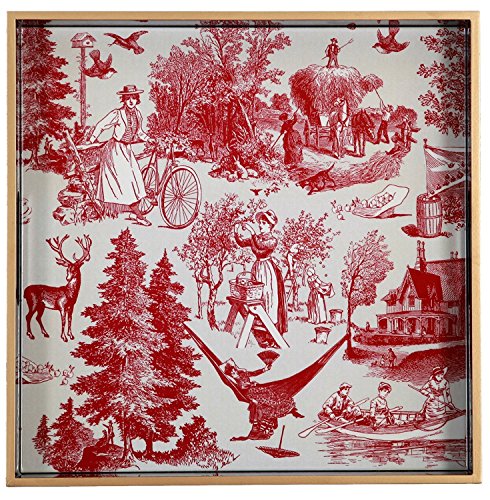 Square Decorative Wood Serving Tray, 12" X 12", Country Harvest Red, Farmers, Toile Pattern, Holiday Celebration, Classic Vintage 1.5" High, "Designed and Manufactured Exclusively for TSC Giftables"