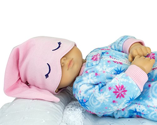 This cozy warm sleeper couldn't be softer! Your little bitty baby doll will feel oh so cute and warm with these snowflake print footy pjs. An adorable light pink night cap folds down to sleeping eyes. Perfect for 15 inch dolls including American Girl. Doll Not Included. © 2016 Sophia's- All Right Reserved. Not affiliated with American Girl ®, Reg. Trademark of American Girl, LLC.Feature