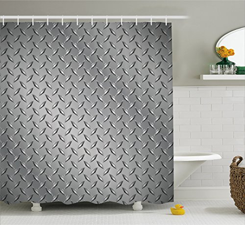 Grey Decor Shower Curtain by Ambesonne, Cross Wire Fence Netting Display with Diamond Plate Effects Chrome Kitsch Motif, Fabric Bathroom Decor Set with Hooks, 70 Inches, Silver