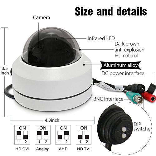 -. Feature : FULL FUNCTION AND 4 IN 1:The PTZ Camera Support AHD/TVI/CVI/CVBS 4 in 1 output.The 2.5" dome camera have full function of other camera like Coaxial Cable Control,Remote Pan/Tilt,1080P HD,IR-CUT,16 Preset,Night Vision,4x Optical Zoom,IP66 waterproof. / FULL COVERAGE:Horizontal rotation 355 ° continuous rotation with pan speed 0 °/s-25°/s,Vertical 0-90°with tilt speed 0 °/s-20°/s,Support automatic flip,that make the dome camera full coverage / IP66 WATERPROOF AND METAL ANTI-EXPLOSION DOME CAMERA: The IP66 waterproof and brown color anti-explosion dome cover support lightning protection and ati surge for bad weather / The case of the dome camera is made of anti-explosion metal.The 2.5" dome is made of brown color anti-explosion cover / WARRANTY:30 DAYS MONEY BACK GUARANTEE,A LIFE TIME WARRANTY