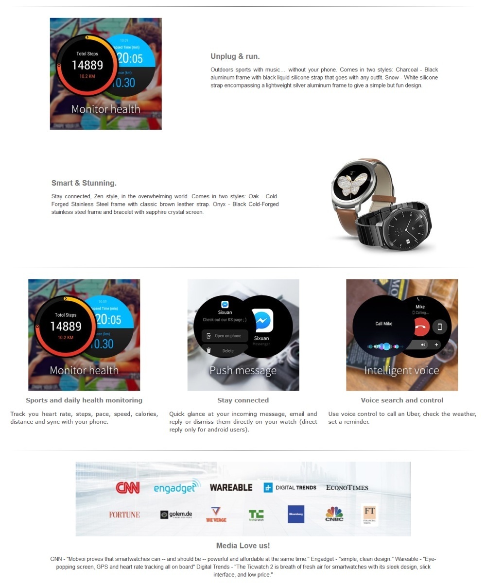 Ticwatch 2 is an innovative smartwatch. With sleek design and our unique Ticwear OS, the smartwatch can be beautiful and powerful. Get notification on your wrist, speak to Ticwatch 2 to get an Uber, set reminders or make a call. Want to go for a run? Go, and the watch tracks your steps and heart beats without a phone. So get one, and enjoy the beauty of technology.