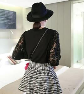 "袖レース フラワー刺繍 透け感 長袖トップス カットソー エレガントトップス 長袖 ミニ丈 ドルマンスリーブ 春夏