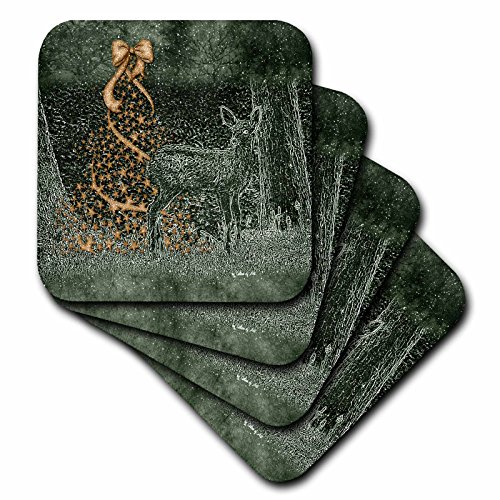 3dRose LLC cst_25887_2 Etched Deer with Christmas Tree in Green and Gold Soft Coasters, Set of 8