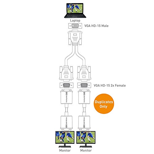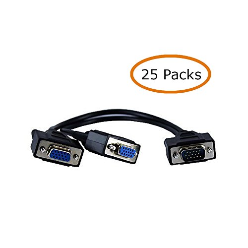 Studio : ACL Publisher : ACL Binding : Personal Computers Product Description The VGA monitor y-splitter cable is a great solution for duplicating images from a computer to two identical screens. Applications include security monitors, conference room presentations or video in a house of worship. Easily connect two monitors to a single VGA source computer. Simply attach VGA cables (sold separately) from the monitors to the female ends of this cable adapter. Supported video resolutions include 800x600 (svga), 1024x768 (xga), 1600x1200 (uxga)and 1080p for high resolution monitors. Specifications - host connector: 1 x 15-pin VGA male - display connectors: 2 x 15-pin VGA female - universal VGA compatibility with computers and displays. 0