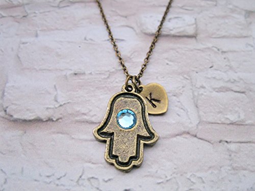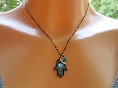 -. Title : Handmade Designer, Hamsa with initial Necklace, Hand Necklace, Gold Brass oxide, Aquamarine, 16"