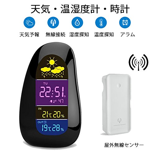 -. Feature : 【室内・屋外温湿度】本体と無線センサーに温湿度を探知する高精度なセンサーが搭載されています。屋外センサーは、お庭、ベイビー部屋、会議室、倉庫、温室、バルコニー置きたい場所にどこでも置けます。室内屋外の温度と湿度を測定し部屋などの状態を良好に保ち、バクテリア、ダニ、カビの生育を防ぎます。乾燥や湿気を管理、室内外の環境を整えましょう。 / 【多機能デジタル温湿度計】室内外の温度、湿度、時間、アラム、スヌーズ,カレンダー(曜日表示)。記録された温湿度の最大値・最小値を調べることができます。標準的な12時間と24時間)をご自由に切替可能です。大画面スクリーンは温度、湿度、時間、天気がアイコンで一目で分かります。大きな文字で眼鏡を外しても簡単に情報を読むことができます。 / 【天気予報】室内屋外の温湿度の変化を探知し、晴れ、雲が多い、曇りや雨四つの天候を天気アイコンでお知らせいたします。時間ごとの天気予報を入手し、日程や計画を立てましょう。とても便利です。 / 【温湿度計の用途】 お肌のコンディションと人の健康は季節の変わり目や生活環境の影響を大きく受けています。本製品は室内の温度と湿度を正確に監視できます。風邪の予防、健康を管理の必需品です。インフル、熱中症、カビ対策以外にもお肌への潤い環境チェック、赤ちゃんの健康管理、熱中症カビ対策、インフルエンザ風邪対策できます。 / 【温湿度測定】・温度探知範囲:0 ℃ - 50℃ (32℉ - 122℉) ・温度探知誤差:0℃ - 40℃ +/- 1.0℃ ・温度精度:1℃ ・湿度探知範囲:20% - 90% ・湿度探知誤差:+/- 5% ・湿度精度:1%。 内容物:本体、屋外無線センサー、専用ACアダプター、USBケーブル、日本語取扱説明書