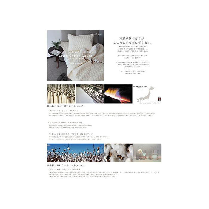 거즈 원단은 전통 기술「이즈미 무명」를 사용.이즈미 무명은 에도 시대 보다 오사카부의(미나베)남부(이즈미시)나오제 직되고 온 면직물.숙련 직공(직인)가 짜 올린 면직물은 박수 인데 튼튼한 것이 특징입니다.「린넨」를 조금 더하는 것에 흡수성 환기성이 업.린넨은 사용한 것 오면 보풀 서가 출생,부드러움이 증가,후와(불화) 두둥실 두께가 태어납니다.