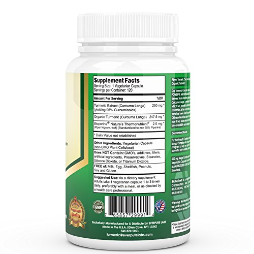 -. Binding : Health and Beauty -. Brand : Everpure -. EAN : 0811996848923 -. Feature : WHERE ARE EVERPURE PRODUCTS MADE? → All of our products are proudly Made in the USA. Everpure Labs is an NSF certified company and all products are made according to strict GMP standards. EASY TO USE → As long as you take it consistently as instructed, you will feel the awesome anti-inflammatory benefits. 1-3 capsules can be taken on an empty stomach or after a small meal. Its that easy! / WHY IS THIS THE MOST EFFECTIVE TURMERIC CURCUMIN COMPLEX AVAILABLE? → Our Formula contains 95% Standardized Curcuminoids - Organic Turmeric- and Bioperine(Black Pepper) All contained in a vegetarian capsule with absolutely no harmful additives. 2 FREE BONUSES →1. '12 Ancient Holistic Secrets' Ebook 2.Tips to better increase your results sent by email. / WHAT IS THE TURMERIC CURCUMIN MEGA COMPLEX? → Turmeric Curcumin is nature's strongest anti-inflammatory and anti-oxidant. It has been used for thousands of years in Ayurvedic and Traditional Chinese Medicine to relieve inflammatory conditions in the body. / WHY EVERPURE? → Are you are an educated, savvy consumer that knows exactly what you are looking for? Do you go through the label of any product you buy with a fine tooth comb? If so, than you've come to the right place. Our products are all Free of gluten, milk, peanuts, shellfish, and soy. That has NO additives, preservatives, GMOs, fillers, artificial additives, stearate's, silicon Dioxide, or titanium dioxide. Everpure is a company that was built by health conscious consumers FOR health conscious consumers. / It's because of this that we can make a guarantee unlike any other you've seen for Turmeric Curcumin products. We like to refer to it as our better than money back guarantee and here it is.. Try our Turmeric Curcumin and if you're not pleased with the results we'll give you a full refund no questions asked. 2 FREE BONUSES →1. '12 Ancient Holistic Secrets' Ebook 2. Tips to better increase your results sent by email. -. IsAdultProduct : 0 -. Label : Everpure -. Manufacturer : Everpure -. MPN : esd-fwe-slay16558 -. PackageQuantity : 1 -. PartNumber : esd-fwe-slay16558 -. ProductGroup : Health and Beauty -. ProductTypeName : PERSONAL_CARE_APPLIANCE -. Publisher : Everpure -. Studio : Everpure -. Title : Premium Organic Turmeric (Curcumin) with Bioperine - 120 Veggie Caps, 500mg -. UPC : 811996848923