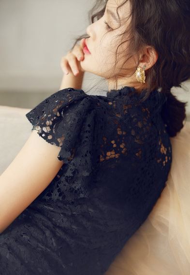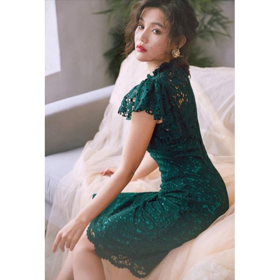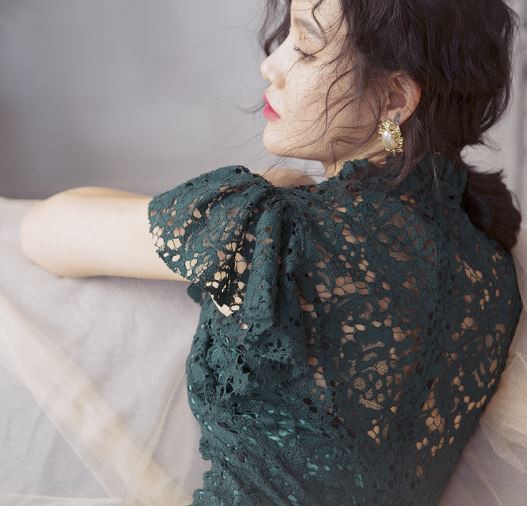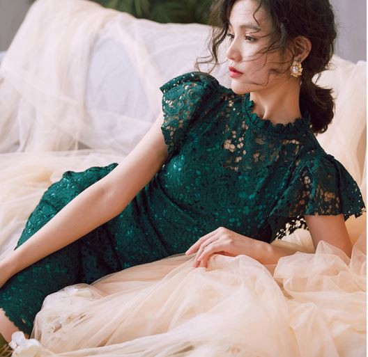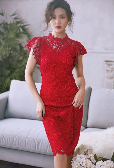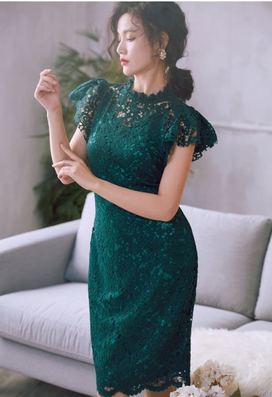透け感のあるレース使いが華やかなパーティードレスです。