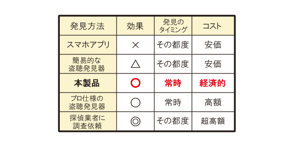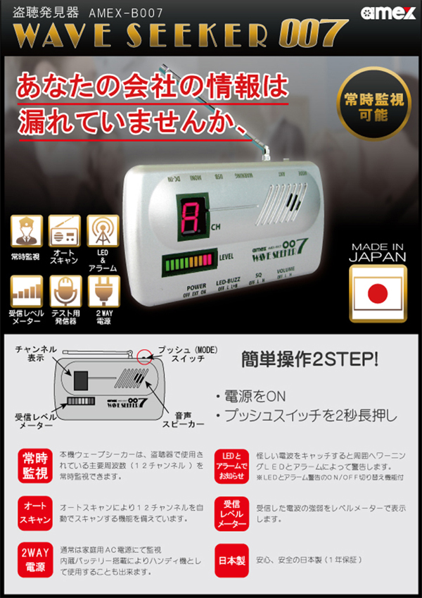 ●本機ウェーブシーカーは盗聴器で使用されている主要周波数(12チャンネル)を常時監視できます●