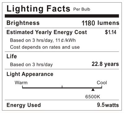 True high efficiency: 1125 lumens. Save energy and money. Perfect replace 75W incandescent bulb by 9W LED. Save over 88% on electricity bill of lighting.