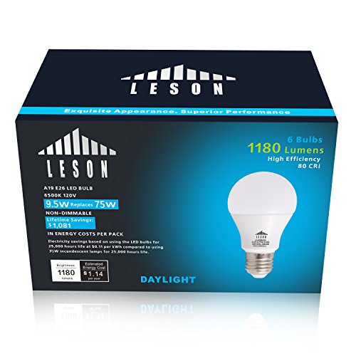 Leson A19 LED Light Bulb Standard E26/E27 Base 9W Energy Saving, Equivalent To 75 Watt Incandescent Bulbs, 1125lm Daylight Cool White 6500k (6 Pack)