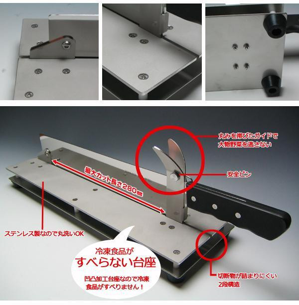| 軽い力で硬い野菜も冷凍食品もスパッと切断できる包丁です。刃先を固定してあるので、柄の部分を下ろすだけ。丸みを帯びたガイド付きだから大物野菜も逃さず、垂直に切断できます。刃の下の台座は切断物が詰まらない2段構造になっており、オールステンレスだから丸洗い可能。食品だけでなく、生花の切り揃え作業にも活躍します。 |