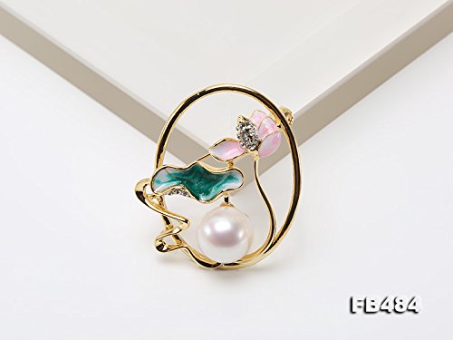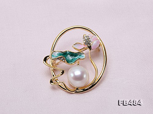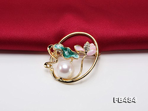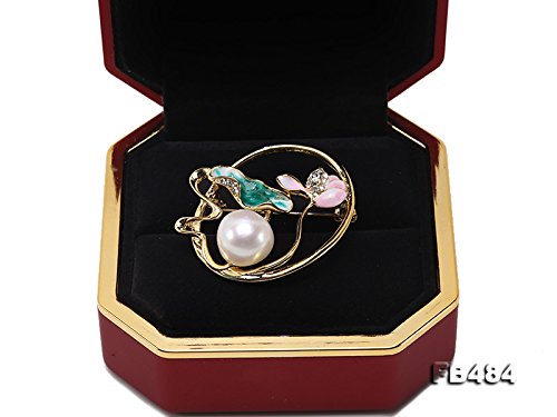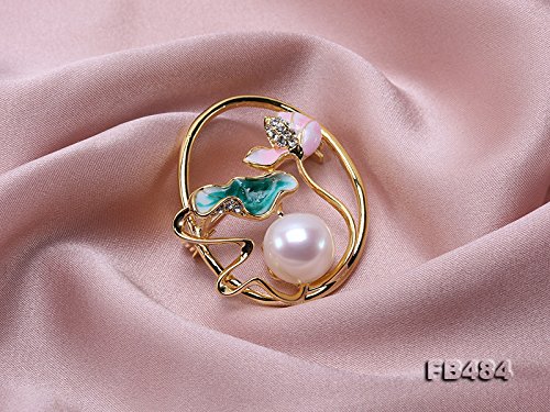 Beautiful white pearl pendant with pink lotus flower and green lotus leaf. Shiny zircons are inlaid. The white Edison pearl has big size of 13.5mm, with very perfect skin and strong lustre.