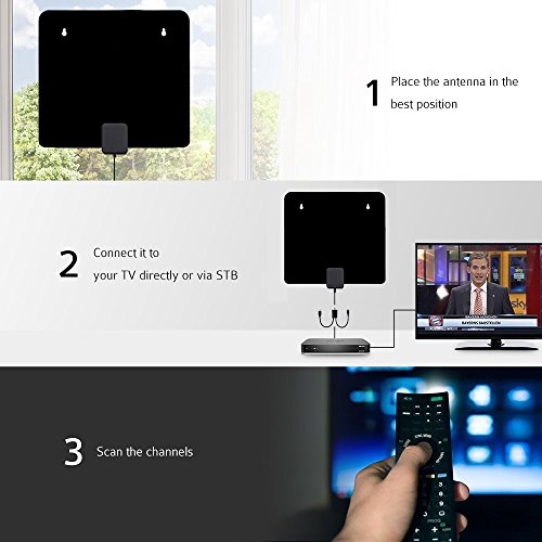 Installation: Installation is a breeze with only 3 steps: unwrap, plug it and scan channels. STEP 1: Stick the antenna on the window/wall. STEP 2: Connect to ANT IN on the back of any digital TV or the set-top box. STEP 3: Scan the TV programs.