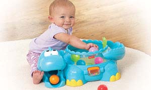 Lively music, fun sounds, bright colors and exciting popping action are all around the Poppity-Pop™ Musical Dino – and they’re helping to stimulate baby’s senses! Grasping and dropping colorful balls into the dino for put and take play helps promote your little one’s fine motor skills and eye-hand coordination. And when balls pop out of the dino or roll out of his mouth, baby can crawl after them, encouraging early development of gross motor skills, too!