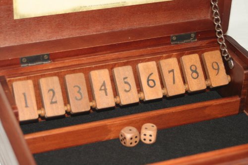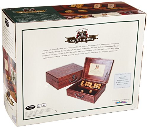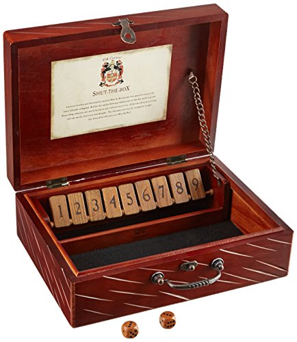 Entertain yourself with this dice game called Shut the Box. This game is centuries old that has been played and loved by sailors and fishermen, and now you can enjoy it too in your very own home. Simply roll the dice and flip over any combinations of tiles that match the numbers you rolled. Then continue rolling until the numbers you roll no longer match the tiles - this is the end of your turn. If the tiles add up to six or less, only roll one die. You can figure out your score by reading left to right - the lowest score wins the game. This game is fun to play with friends but can also be enjoyed by only two people. Everything you need is included in the mahogany finish box and has an attractive look even while being stored. 14" L x 10-1/2" W x 4-1/2" HFeature