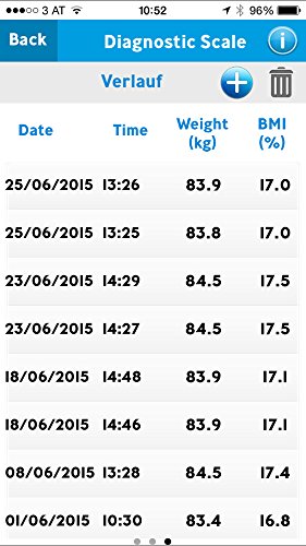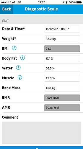 -. Feature : Measures weight, body fat/water/muscle percentage, bone mass, body mass index, basal (bmr) and active metabolic rate (bmr) / Automatic pairing with smartphones which have Bluetooth Smart 4.0. Your data is Saved in the cloud. The scale app is working with iPhone 4S upwards and Android phones version 4.3 upwards / For exact calculation of calorie consumption you can set your personal activity level (1-5). 8 user memories with automatic user recognition providing you enough space to save your results / Further functions: auto-off, quick start (measurement starts when you step on the scale), switch kg/lb/St - maximum weight 180 kg/396 lb/28 St, display of overloading / Graduation 0,1 % for body fat, water, muscle content/100 g/0,2 lb for weight, bone mass//3 years Warranty