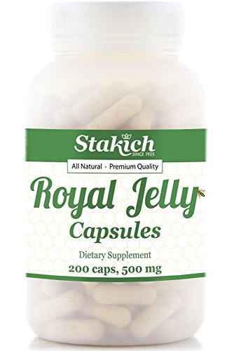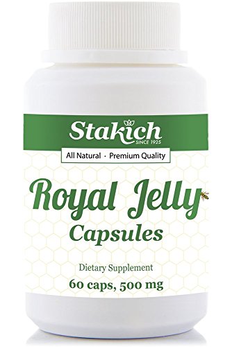 Stakich Royal Jelly capsules contain 500 mg of Royal Jelly Concentrate (powder) equivalent to 1,500 mg of fresh Royal Jelly. Royal Jelly is a nutrient rich superfood packed with all of the B-vitamins, nucleic acid, essential amino acids, fatty acids, enzymes, protein, essential vitamins and minerals. It is the Queen Bee?s only source of food, which enables her to live 40 times longer than the worker bees. Store in a cool, dry place. Use daily as a dietary supplement. Naturally cholesterol, sodium, gluten and fat free.